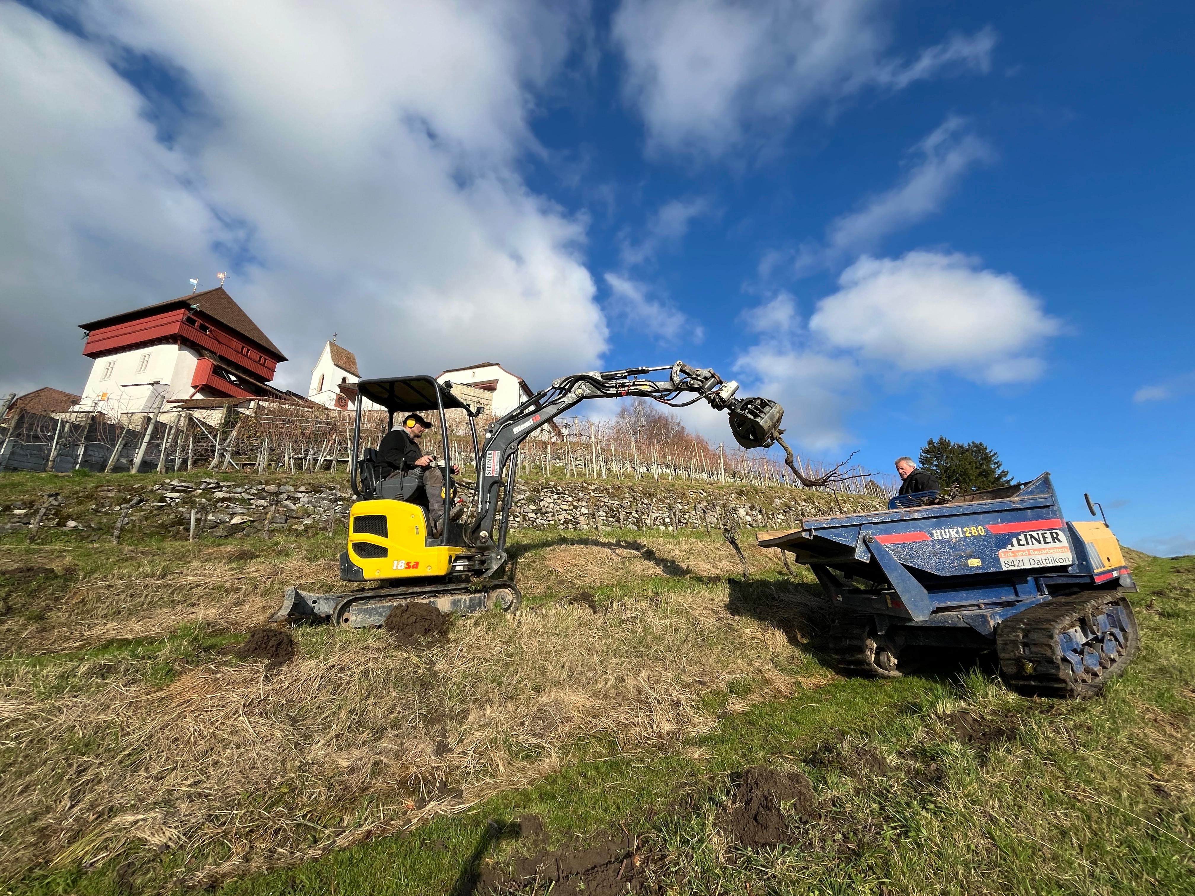 Der denkmalgeschützte obere Teil des Rebbergs mit zwei Trockensteinmauern bleibt unverändert erhalten. Zur Verbesserung der Bewirtschaftung werden die Querterrassen unterhalb der zweiten Trockensteinmauer rückgebaut. Die Erweiterung erfolgt als Streifenanlage mit Direktzug. Die Geländeanpassungen haben bereits begonnen und dauern voraussichtlich bis im Frühling 2026. Erste Pflanzungen von drei neuen, roten Piwi-Sorten sind für Mai vorgesehen, eine weitere Etappe folgt im Frühling 2027.
