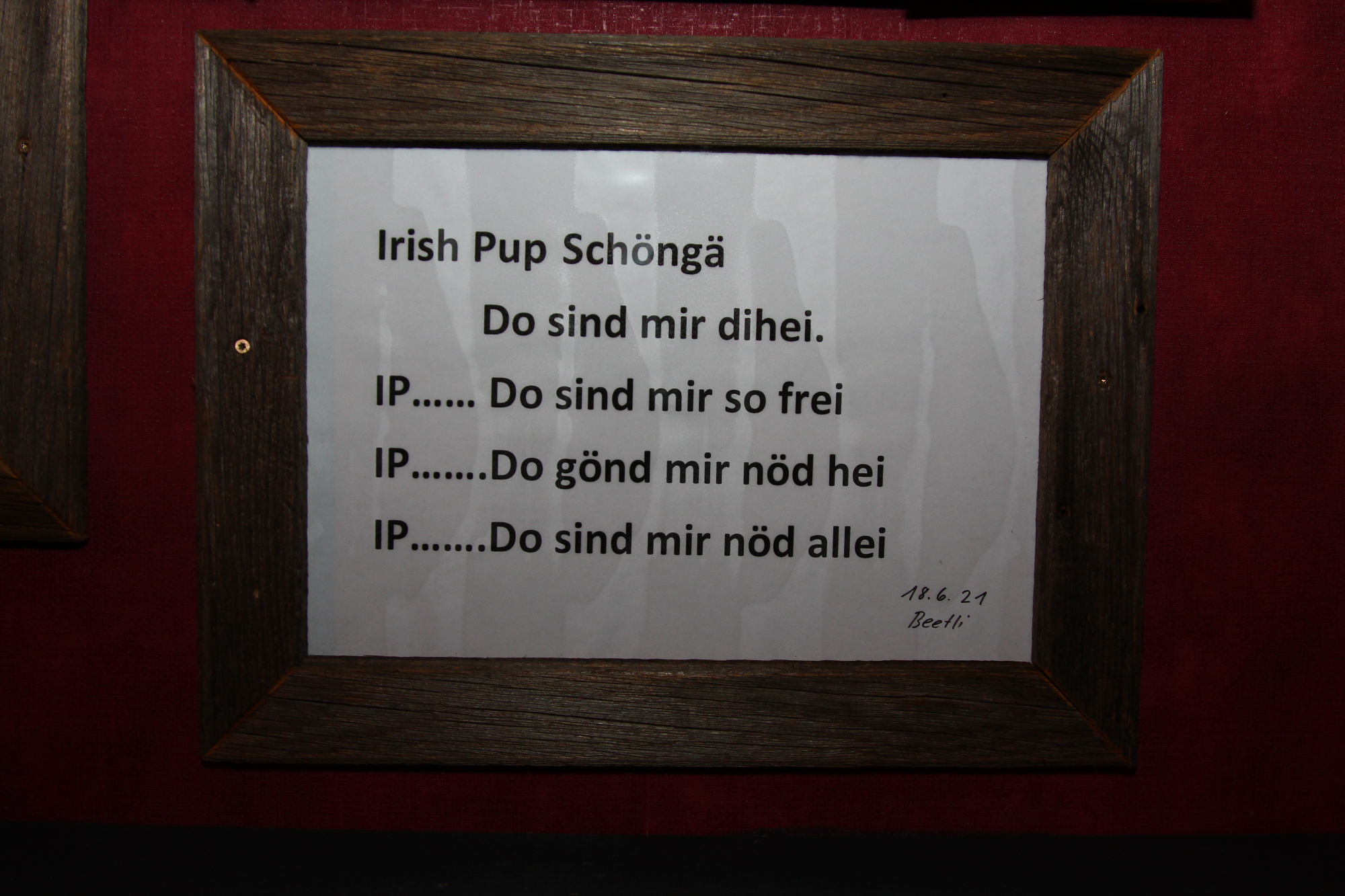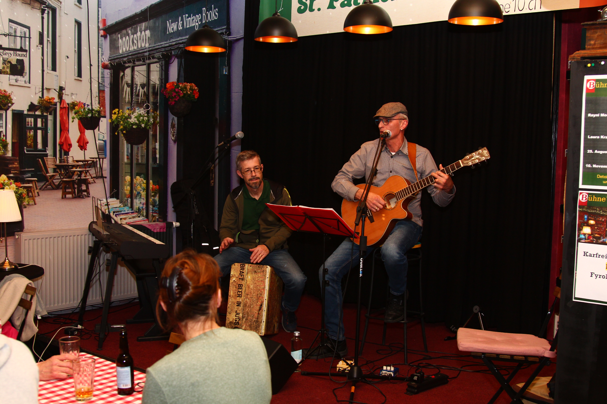 Auf den Brettern der «Bühne10» stehen zwei Mikrofone, ein Keyboard, eine Anlage mit Mischpult und auch Sitzgelegenheiten zur freien Verfügung. Vor der Spielfläche – etwa einen halben Meter tiefer – hat es zwei lange Tische mit je rund zehn Sitzplätzen für das Publikum. Weiter hinten die Bar im Stil eines Irish Pubs. Es ist die lockere, entspannte Kultur der Iren, die zur Wahl dieser Einrichtung geführt hat. Ideengeber war Peter Schuler, der zusammen mit seiner Frau Angelika mehrmals auf der grünen Insel weilte. Als gelernter Schreiner fertigte er die gesamte Einrichtung mit Bar und Bühne selbst an.