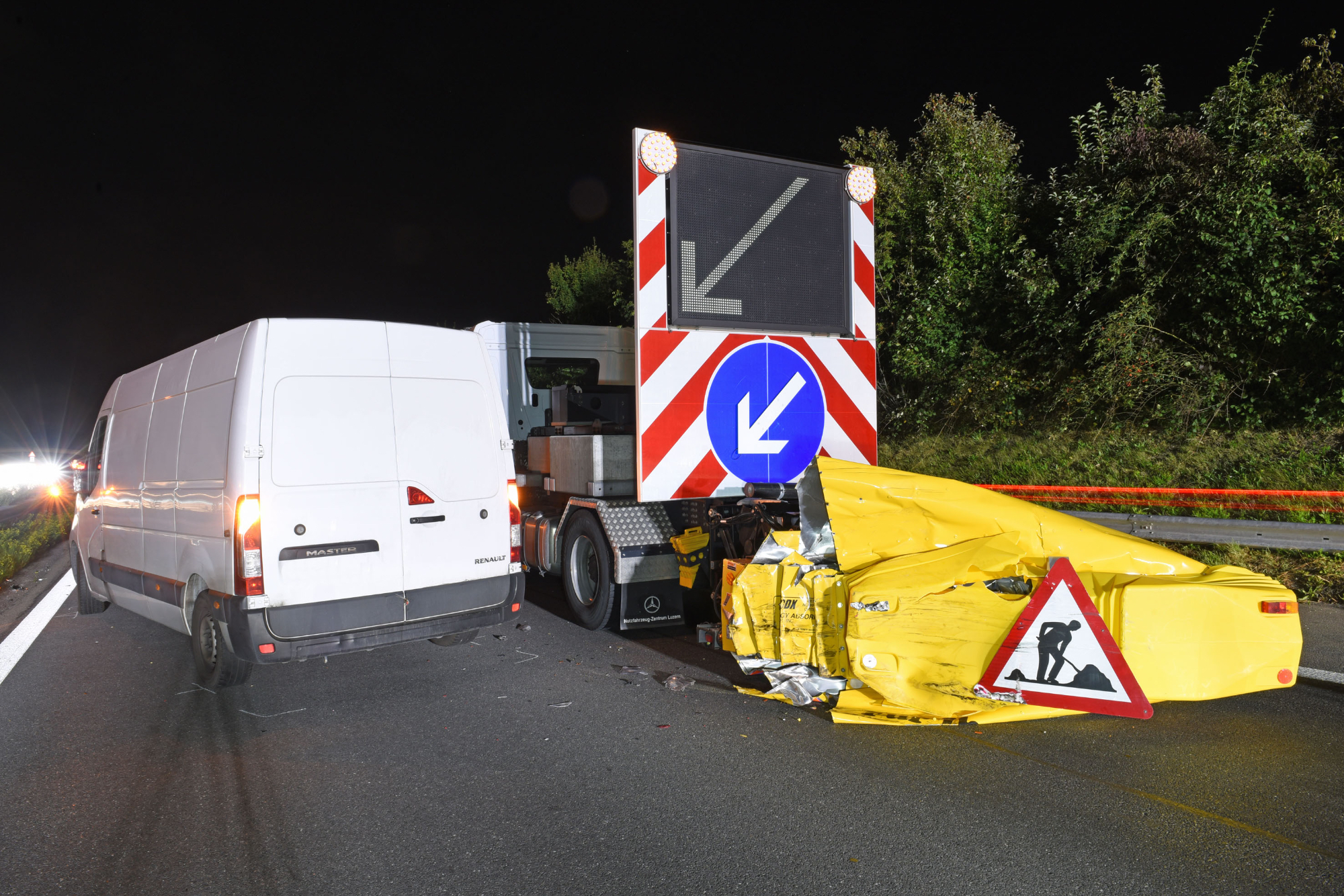 Am Mittwoch kurz nach 20.30 Uhr fuhr ein Lieferwagenlenker auf der Autobahn A2 Richtung Norden. In Schenkon waren zu diesem Zeitpunkt Unterhaltsarbeiten im Gange. Der Lieferwagenlenker übersah dabei die Fahrstreifenabnahme, überfuhr die Warnschwellen und prallte mit der rechte Frontecke gegen den dortigen Anpralldämpfer, welcher die Unterhaltsarbeiten absicherte. Beim Unfall wurde niemand verletzt. Der Lieferwagen war nicht mehr fahrbar und musste abtransportiert werden. An den Fahrzeugen entstand ein Sachschaden von zirka 30 000 Franken.