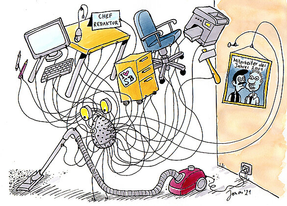 Wie wäre es mit einem «Haushaltsgerät», das immer aufräumt? In seiner Bilderbuchgeschichte «Kosmos räumt alles auf» malt sich Comiczeichner… -